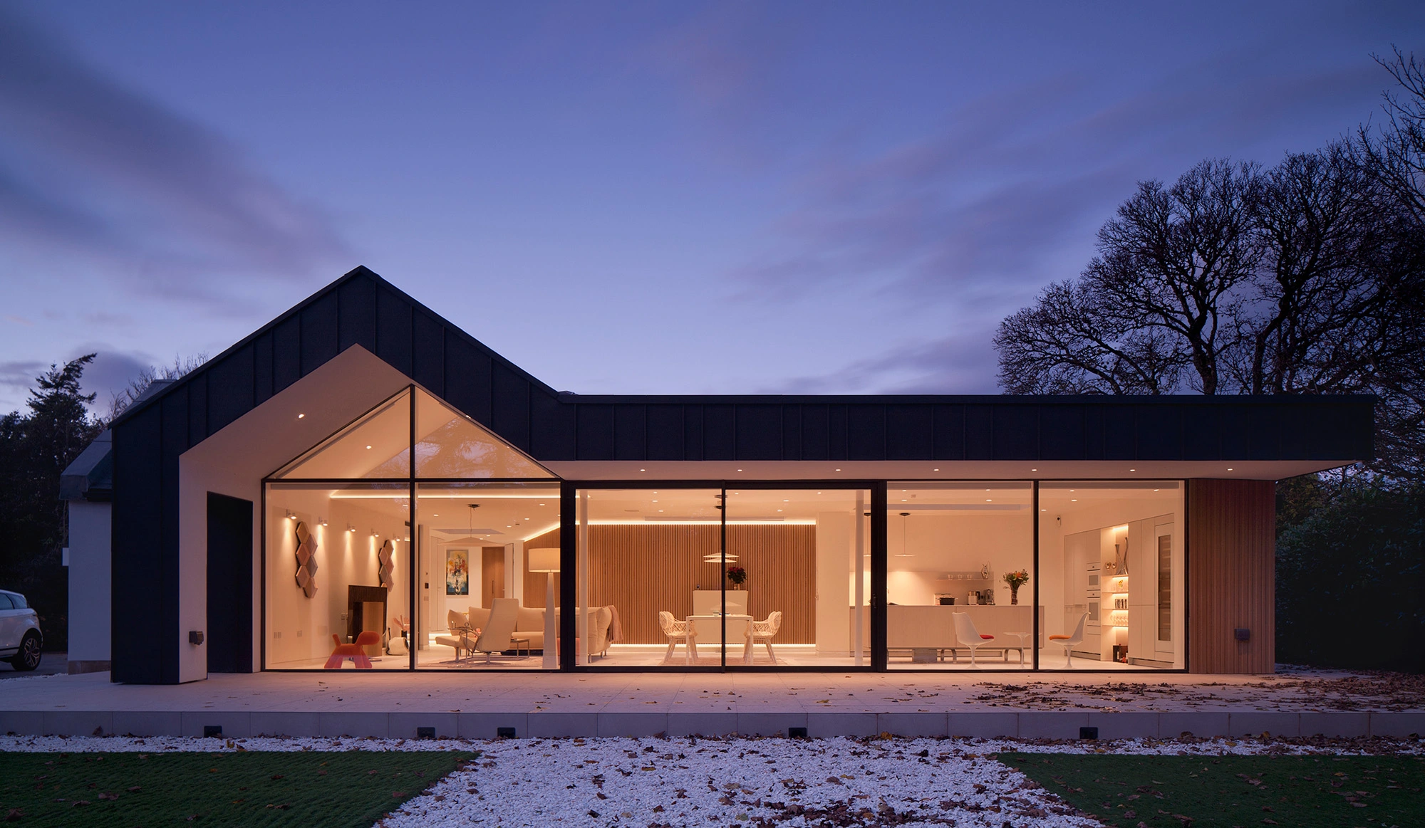 These design‑led principles are not only theoretical; we have applied them directly in one of our own residential projects. In this particular home, by consolidating utility spaces, storage and guest facilities into a compact and efficient central core, the plan of the house has been opened up at the perimeters, allowing the main living space to expand into a singular south facing expansive volume overlooking the rear garden through the floor to ceiling glazed wall and a cantilevered roof providing protection from solar gain and the rainy Scottish weather. The new L-shaped wrap around extension in this example has been devised to not only meet client’s brief in terms of additional floor space but also to conceive circulation as a space that you move through with no dead ends, punctuated by daylight and views. The result demonstrates how design-led retrofit strategies can elevate light, spatial experience and connection to the landscape within an existing 1980s property.